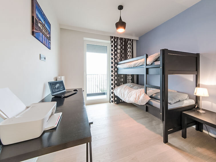 "Havenzicht", 3-Zimmer-Wohnung 125 m2 im 6. Stock. Modern eingerichtet: Eingang mit sep. WC und G-Heizung. Wohn-/Esszimmer mit Esstisch, TV, Digital-TV, Internationale TV-Sender und Stereoanlage. Ausgang zur Terrasse. 1 Zimmer mit 1 x 2 Etagenbetten (90 cm, Länge 200 cm). 1 Doppelzimmer mit 1 Doppelbett (180 cm, Länge 200 cm), TV. Offene Küche (Geschirrspüler, 4 Glaskeramikplatten, elektrische Kaffeemaschine, Kombinationsmikrowelle). Dusche, Doppelwaschbecken. Grosse Terrasse 60 m2. Terrassenmöbel, Sitzplatz, Abstellkammer. Panoramasicht auf das Meer, den Hafen und die Stadt. Zur Verfügung: Waschmaschine, Haartrockner. Internet (Wireless LAN, gratis). Garage Nr. 10 auf dem Grundstück. Bitte beachten: Nichtraucher-Haus. Rauchmelder, Feuerlöscher. Projekt in voller Entwicklung. Geniessen Sie als einer der ersten von dieser Top-Lage zum jetzt niedrigen Preis!