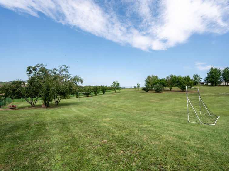 Groot cottage "La Bell'aria", vrijstaand. Aan de rand van de plaats, 1 km van het centrum van Frinco, verhoogde ligging. Voor alleengebruik: terrein 4.500 m2 (omheind) met planten en bomen, wilde tuin, weide. Buitendouche, hot tub, tafeltennis, badminton, patio, prieel (20 m2), terras, tuinmeubelen, grill, parkeerplaats (voor 3 auto's) bij het huis op het terrein. Bushalte 1 km. Attracties in de buurt: Asti 15 km, Casale Monferrato 37 km, Alba 45 km, La Morra 55 km, Barolo 52 km, Torino 76 km. Auto noodzakelijk. het kuuroord is geopend van 30.04.-15.09. Gasten kunnen gebruikmaken van het zwembad (20 x 4 m, 01.06.-15.09.) En de snackbar van Agriturismo, ongeveer 100 m, tegen betaling (EUR 15 per persoon per dag).
