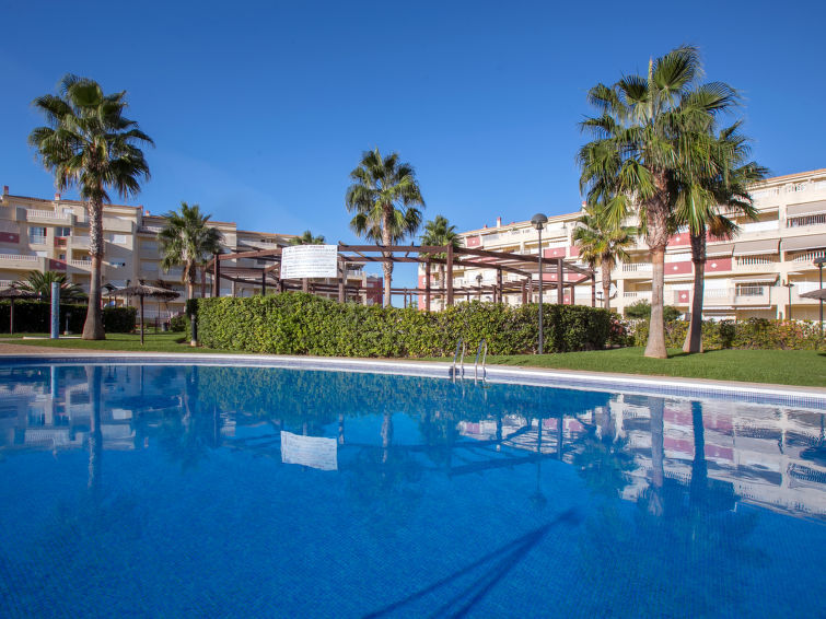 Les Marines 3 km van Dénia: Mooi, gezellig flatgebouw "Playa Sol". In de plaats, 5 km van het centrum van Dénia, rustige, zonnige ligging, 400 m van zee, 400 m van het strand. Voor medegebruik: terrein (omheind) met gazon en bomen, openluchtzwembad niervormig (16 x 8 m, 80 - 230 cm diepte, seizoensgebonden beschikbaarheid: 01.Jan. - 31.Dec.). Kinderzwembad, buitendouche, kinderspeelplaats (glijbaan, schommel). In het huis: lift. Parkeerplaats op het terrein. Winkel, levensmiddelenwinkel 300 m, supermarkt 1.4 km, restaurant, bar, café 300 m, bushalte 350 m, treinstation 5 km, veerboot 4.7 km, zandstrand "Les Marines" 400 m. Surfschool 600 m.